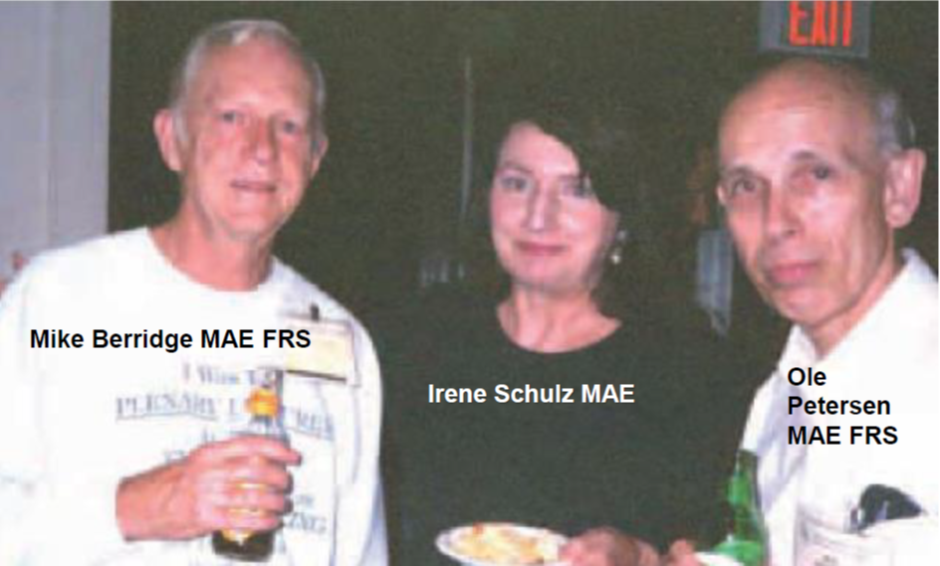 Mike Berridge, Irene Schulz (in whose laboratory at the Max Planck Institute in Frankfurt the critical experiments showing the calcium releasing effect of IP3 were carried out) and Ole Petersen at the 2003 Gordon Research Conference on Calcium Signaling in South Hadley, Massachusetts